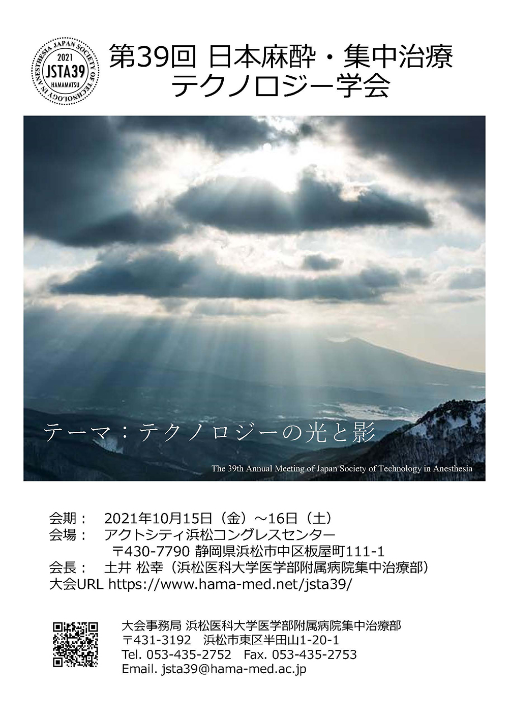 ![]() 会 長 土井 松幸(浜松医科大学医学部附属病院集中治療部) 会 期 2021年(令和3年)10月15日(金)- 16日(土) 会 場 アクトシティ浜松コングレスセンター 〒430-7790 静岡県浜松市中区板屋町111-1 大会URL https://www.hama-med.net/jsta39/ 大会事務局 浜松医科大学医学部附属病院集中治療部 〒431-3192 浜松市東区半田山1-20-1 Tel. 053-435-2752 Fax. 053-435-2753 Email. jsta39@hama-med.ac.jp |